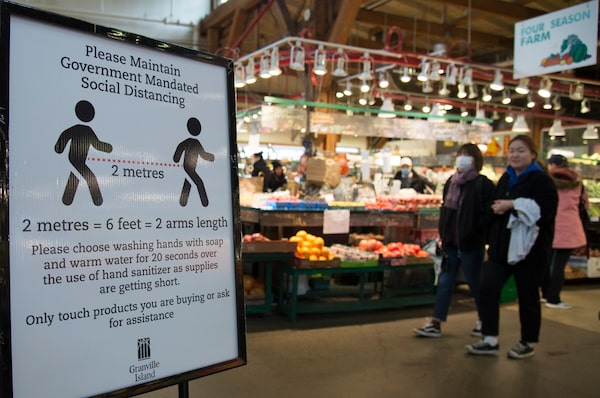 A physical distancing sign is pictured at a normally busy Granville Island Public Market on Granville Island in Vancouver on Thursday.JONATHAN HAYWARD/The Canadian Press