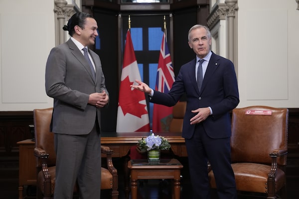 Manitoba Premier Wab Kinew, left, meets with Prime Minister Mark Carney in Ottawa on Tuesday.Adrian Wyld/The Canadian Press