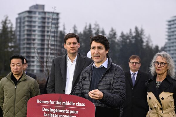 Prime Minister Justin Trudeau makes a housing announcement alongside B.C. Premier David Eby and Vancouver Mayor Ken Sim in Vancouver on Feb. 20.JENNIFER GAUTHIER/Reuters