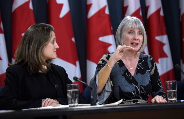 Deputy Prime Minister Chrystia Freeland listens as Minister of Health Patty Hajdu speaks during a press conference on COVID-19 at the National Press Theatre in Ottawa, on March 16, 2020.Justin Tang/The Canadian Press