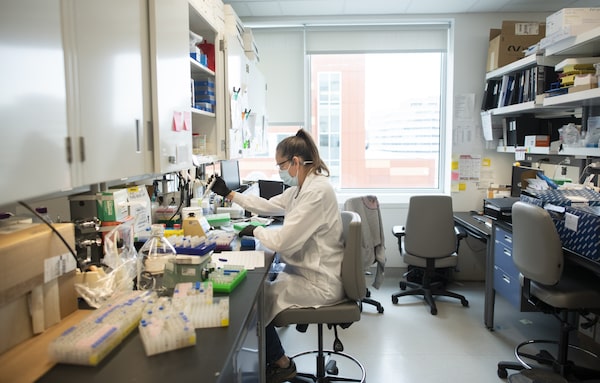Nathalie Martel, a lab technician, works with serum samples to be tested in an assay at the McGill University Health Centre, on April 21, 2022.Fred Lum/the Globe and Mail