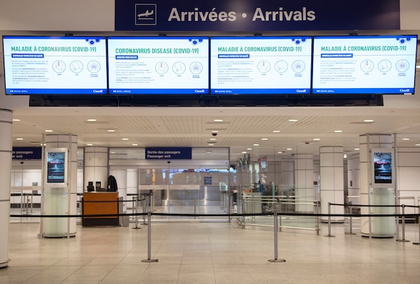 Coronavirus information signs are shown at an empty arrivals hall in Montreal–Trudeau International Airport, Friday, March 20, 2020, as COVID-19 cases rise in Canada and around the world.Graham Hughes/The Canadian Press