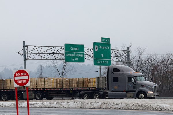 A freight truck carrying lumber crosses the border from Canada to the U.S. as seen from Champlain, N.Y., on March 5. In response to U.S. tariffs, the federal government pledged billions in support for workers and businesses.Brendan McDermid/Reuters