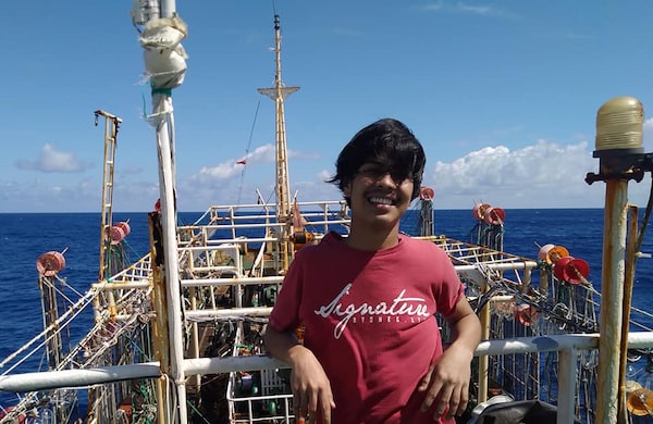 Daniel Aritonang leans against a railing of the bridge on the Chinese squid-fishing boat the Zhen Fa 7 in this undated photo, while out at sea.Ferdi Arnando via Facebook/Ferdi Arnando via Facebook