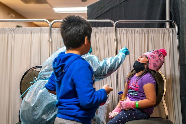 Addison Moonias, five, of Neskantaga First Nation is swabbed for COVID-19 before she and her family head home for the holidays after nearly two months of being evacuated to Thunder Bay, Ontario, due to a water crisis.DAVID JACKSON/The Globe and Mail