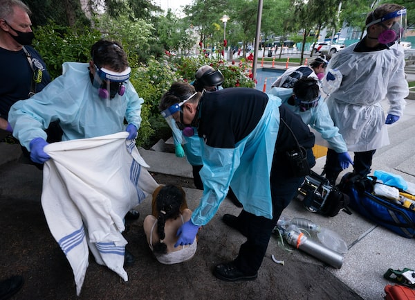 Paramedic Specialist David Hilder from B.C. Ambulance tries to speak to a drug overdose victim in downtown Vancouver, on June 23, 2021.JONATHAN HAYWARD/The Canadian Press