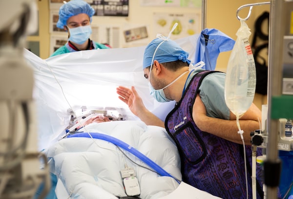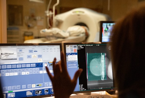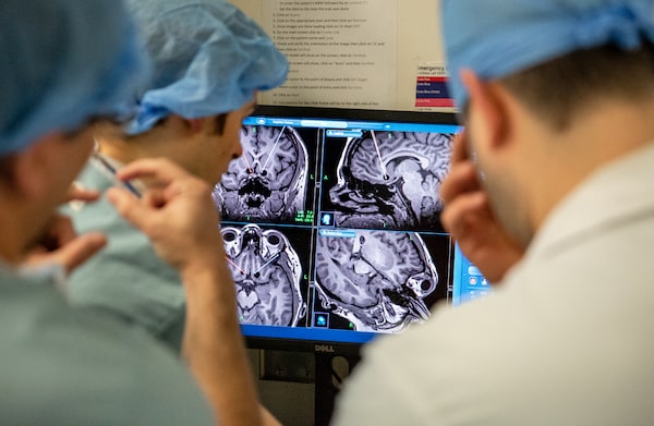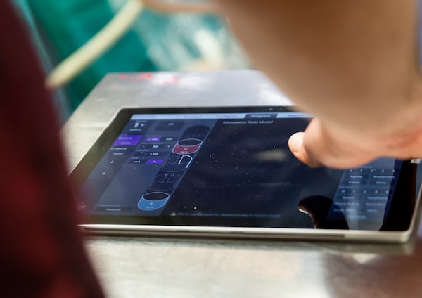 Once the electrodes are inside her brain, a technician controls the current on a tablet under Dr. Lipsman's direction.