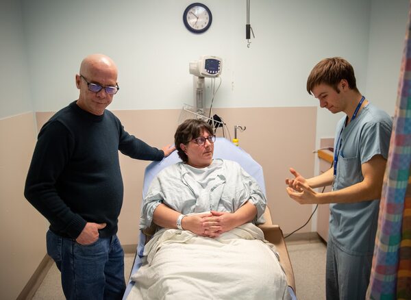 Serena Kelly, 47, and her husband Ron, left, listen to surgical resident Dr. Benjamin Davidson, right, before she is prepped for deep brain stimulation at Sunnybrook.