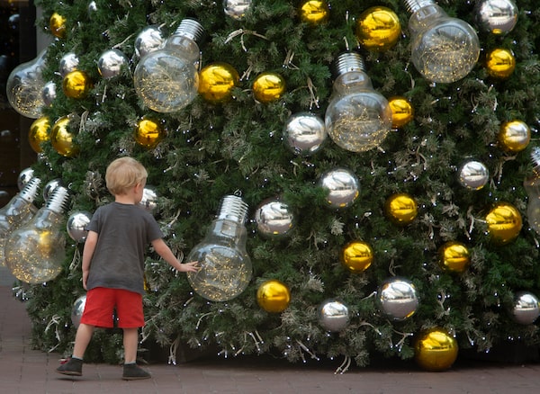 A child touches Christmas tree decorations at a shopping mall.Denis Farrell/The Associated Press