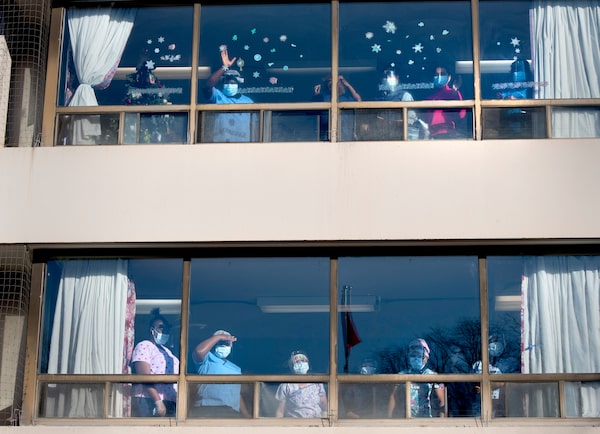 Nurses and PSWs at Sienna Senior Living St. George Care Community in Toronto wave from the windows as a support rally takes place in front of the building on Jan. 7, 2021.Frank Gunn/The Canadian Press