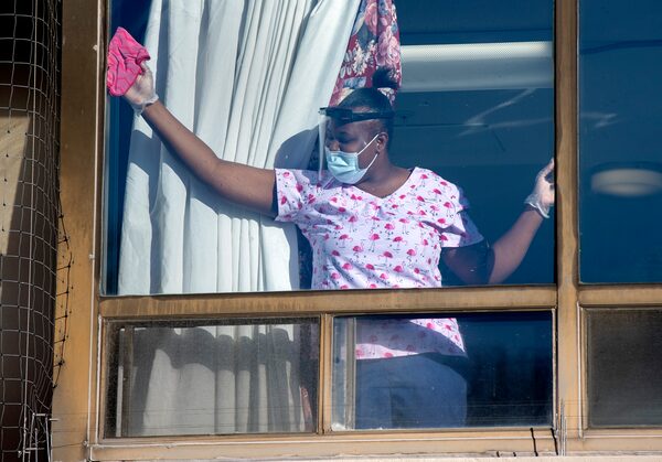 A worker at Sienna Senior Living St. George Care Community in Toronto cleans the inside of windows on Jan. 7, 2021.Frank Gunn/The Canadian Press