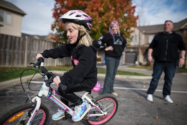 Jody McKenzie and Doug Grozelle walk alongside their daughter Mackenzie, 6, as she rides her bicycle near their home in Binbrook, Ont., on Oct. 27, 2020.Tijana Martin/The Globe and Mail