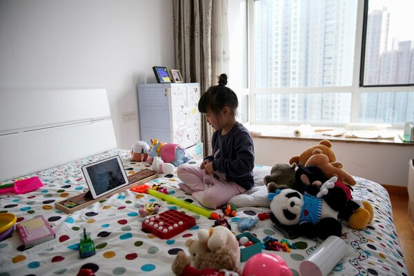 Lin Wowo, 5, talks to her friend through Facetime on an iPad in her home in Shanghai, China, as the country is hit by the COVID-19 outbreak, on Feb. 25, 2020.ALY SONG/Reuters