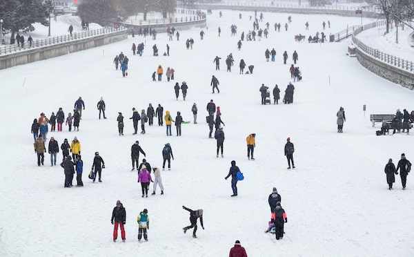 People are pictured on the Rideau Canal Skateway in Ottawa on Feb. 18, 2024.Justin Tang/The Canadian Press