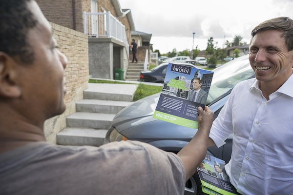 Down the street, as his daughter plays on her scooter, Gabriel Ayomoh tells Mr. Brown he has his support and poses for a photo. The machinist later credits Mr. Brown for much of the PC Party’s success in the provincial election and embraces his decision to run in Brampton.