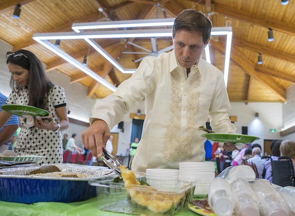 After leaving the backyard gathering, Mr. Brown slips on a traditional embroidered Filipino shirt on the way to his next event, a seniors' town hall. He is the only mayoral candidate there and soon has the crowd hanging on his every word. He opens with a few phrases in Tagalog and says he has been to the Philippines three times. He points to Ms. Gualtieri, whose background is Italian, and tells them she sometimes gets mistaken for a Filipina. He says his best canvassers are his mother and a lady in the crowd.