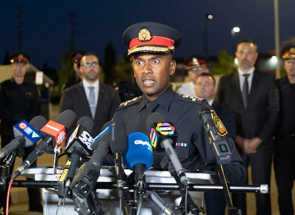 Peel Regional Police Chief Nishan Duraiappah speaks to the media in Mississauga, Ont., on Sept. 12, 2022. Peel police have laid more than two dozen extortion charges targeting the South Asian community and are also investigating incidents where businesses have been fired upon.Arlyn McAdorey/The Canadian Press