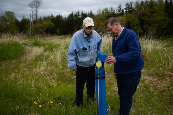 Former Hazelbrook, PEI, mayor Brian Gallant chats with resident Doug Jenkins about a shuttered landfill in their community that leaks chemicals into the groundwater.