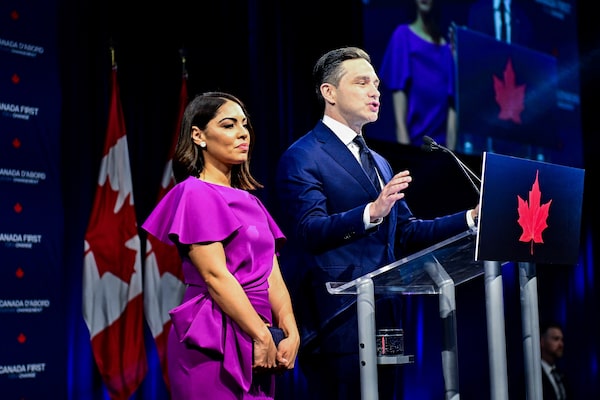 Conservative Leader Pierre Poilievre delivers remarks alongside his wife Anaida Poilievre at the Conservative Party of Canada election night watch party in Ottawa, on Tuesday, April 29, 2025.Spencer Colby/The Canadian Press