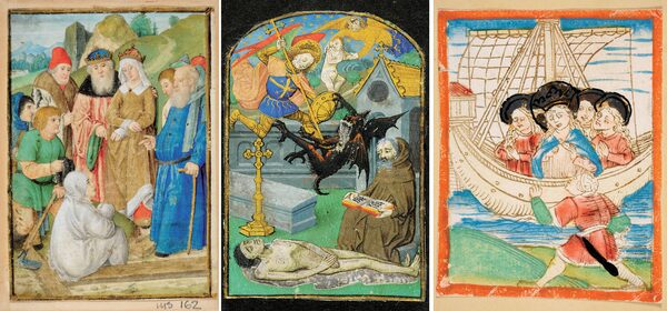 Three of the medieval artworks on display at the Montreal Museum of Fine Arts's Resplendent Illuminations exhibition. Left: Saint Helena and the Invention of the True Cross (c. 1520), from an anonymous artist. Middle: Monk (Hermit) Praying for the Dead Man and Struggle for his Soul Between Saint Michael and the Devil (c. 1470), from the Master of the Échevinage of Rouen. Right: The Voyage of Saint Ursula (c. 1480-1490), from the workshop of the Housebook Master of Augsburg.Gregory Houston/MMFA