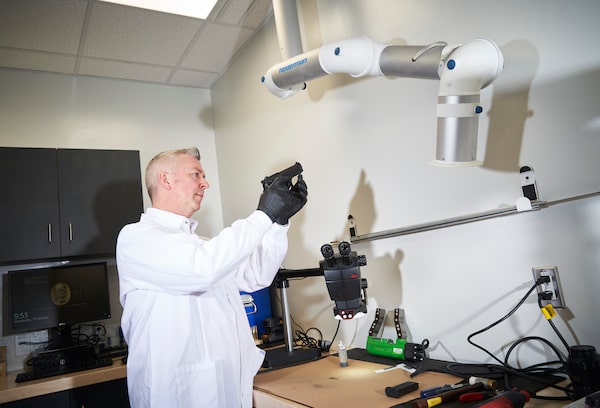 Manager Darryl Barr of the Forensic Firearms and Toolmark Laboratory examines a firearm at a lab in Calgary on Feb. 19, 2020. The Calgary Police Service built its the lab in 2011, becoming the first municipal police service in Canada to conduct ballistics imaging in-house.Todd Korol/The Globe and Mail
