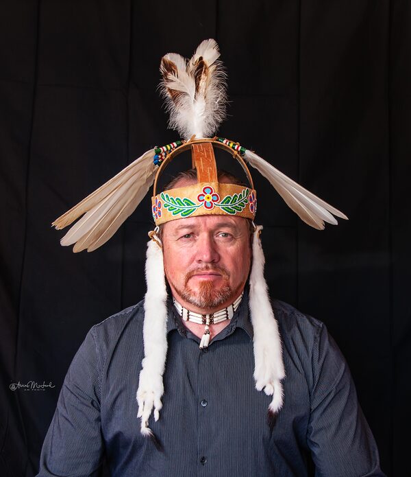 “The beadwork style represents the women’s roles in supporting the leader wearing the ceremonial headdress,” Mr. McLeod said. “The seven white eagle feathers signify the commitment that a leader makes to lead with responsibility following the seven grandfather/grandmother teachings.”