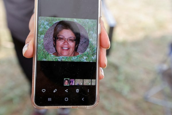 A person holds a phone showing a photo of Gloria Lydia Burns, 62, who was killed on James Smith Cree Nation.DAVID STOBBE/Reuters