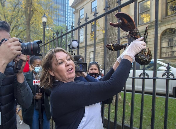 Cheryl Maloney, a member of the Sipekneꞌkatik First Nation, and activist, sells lobster outside the legislature in Halifax on Friday, Oct. 16, 2020.The Canadian Press