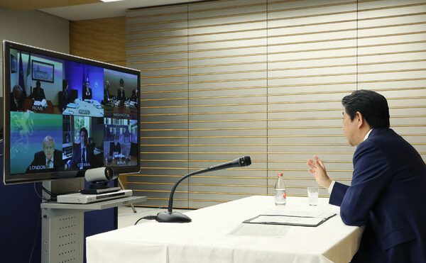 Japanese Prime Minister Shinzo Abe speaks with other G7 leaders during a video conference late on March 16, 2020.Supplied/AFP/Getty Images