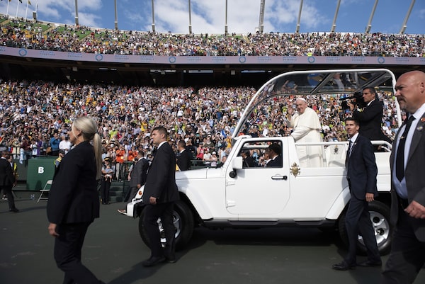 Pope Francis waves at the crowd as he makes a lap at Commonwealth Stadium in Edmonton on July 26.Gavin John/The Globe and Mail