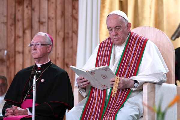 Pope Francis speaks to people at the annual pilgrimage event in Lac Ste. Anne, Alta., on July 26.Nathan Denette/The Canadian Press