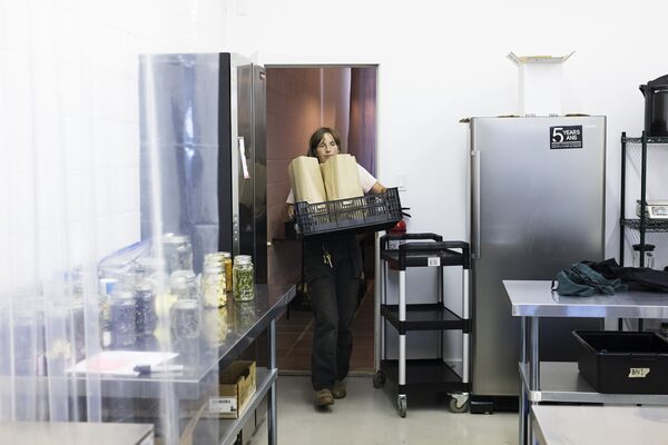Claire Gendron, the farm's production manager, carries fresh produce into the shelter society's kitchen.