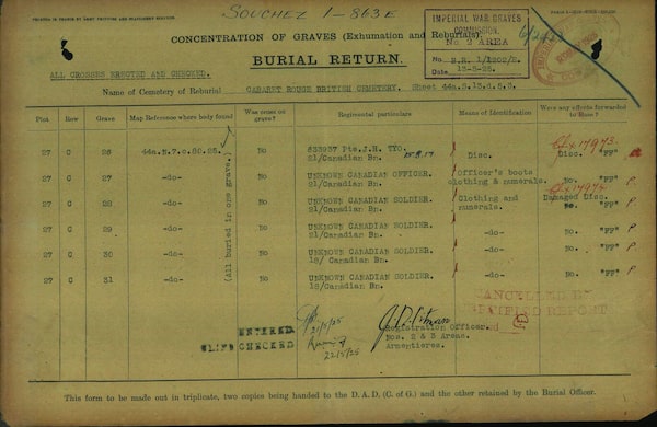 In August, 1917, Arthur, almost 30, and James, barely 20, fought with separate infantry units at the Battle of Hill 70, near the town of Lens, where Canadians suffered more than 9,000 casualties during an 11-day battle. James, in the 21st Battalion, died on the first day of the assault. While the bodies of most of his battalion’s dead were brought back to the rear, he and five other Canadians were buried together in a mass grave near the junction of two trenches seized from the Germans. It would be seven years before their remains were exhumed, and among them, only James could be immediately identified.