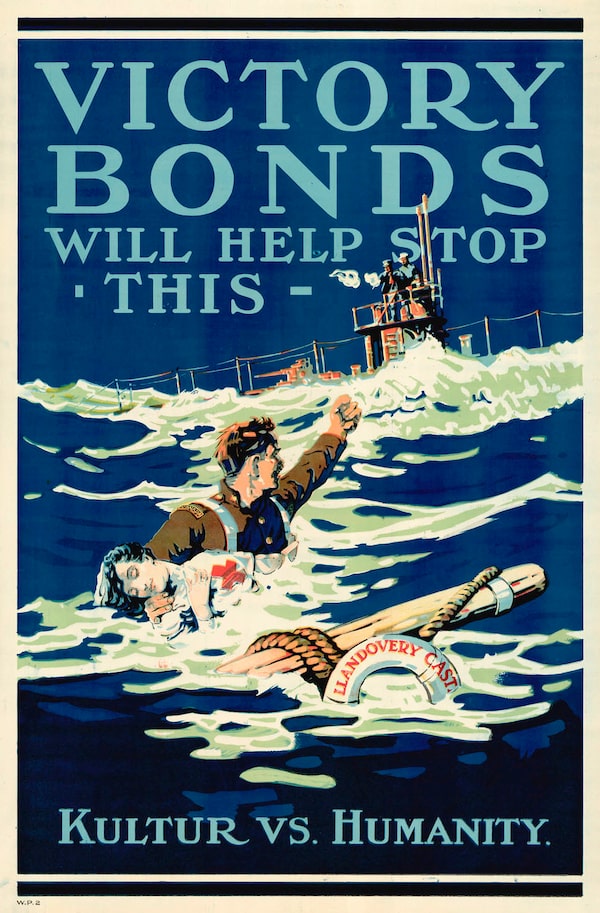 A 1918 poster depicting the aftermath of the torpedoing of the Llandovery Castle demonstrates the disaster's role in galvanizing Canadians near the end of the war.Library and Archives Canada