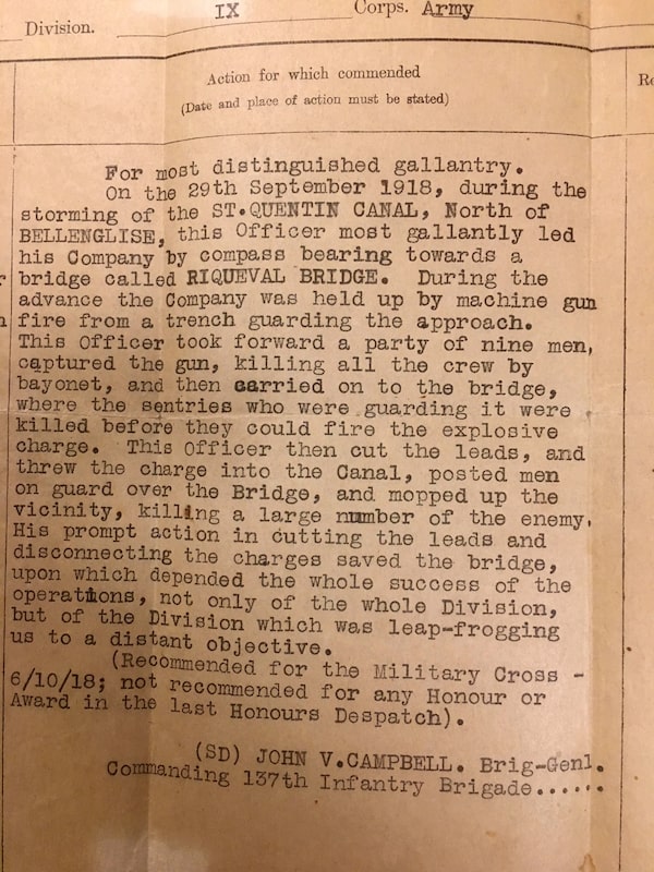“His prompt action in cutting the leads and disconnecting the charges saved the bridge, upon which depended the whole success of the operations, not only of the whole division, but of the division which was leap-frogging us to a distant objective,” read the recommendation letter by Brigadier-General John V. Campbell.