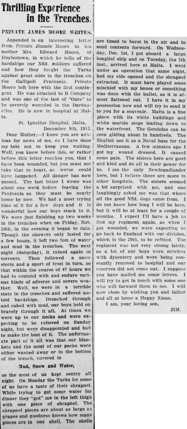 In November, a three-day storm flooded their positions; then came snow and frost. “We were in a terrible state in the trenches and suffered untold hardship,” Pte. Moore wrote in his letter. The day after, while fetching water for dinner, he was hit by shrapnel "as large as grapes.” Severely wounded, he was sent to a hospital in Malta, where the British kept a base, and from there he wrote to his mother that he would try to send her the shrapnel from his leg as a souvenir.