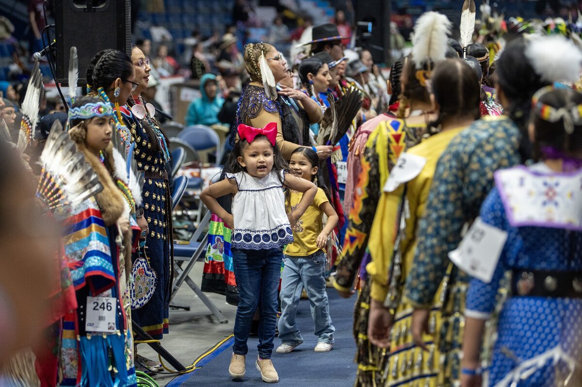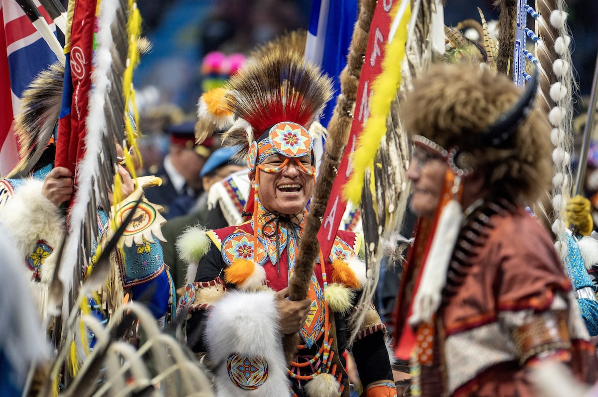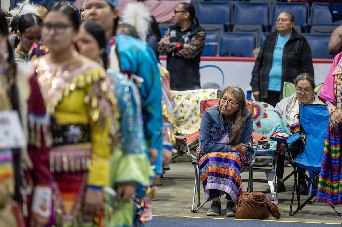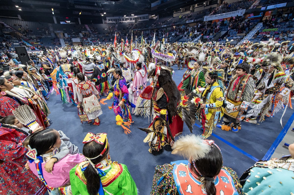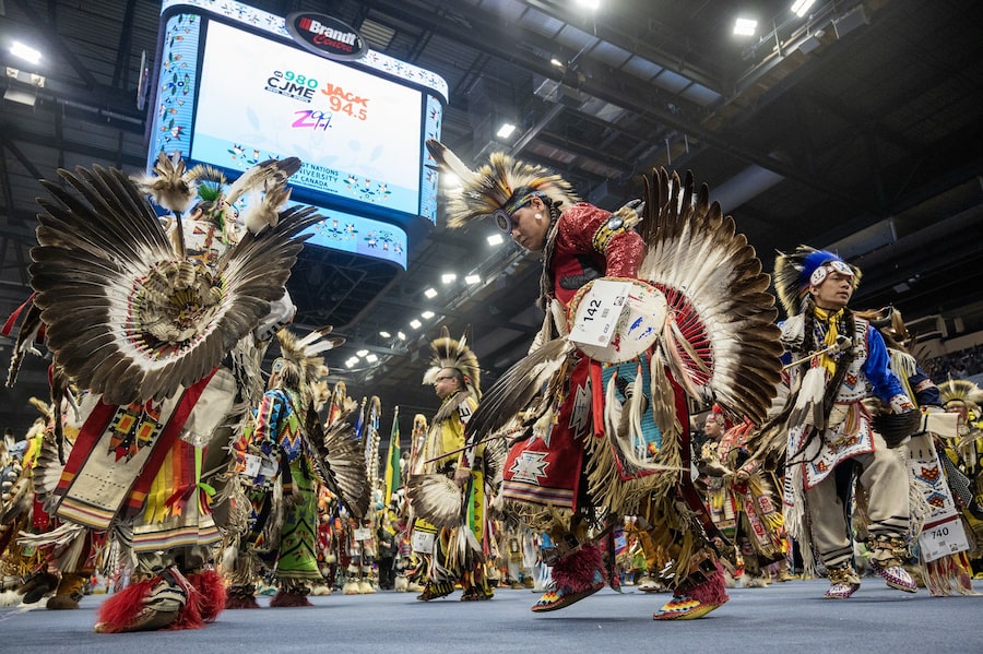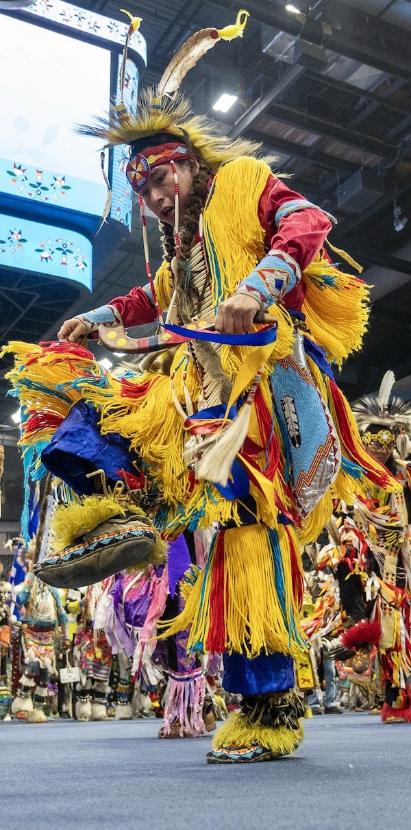 More than 700 dancers and 19 drum groups were competing in the powwow, from tiny tots to golden age seniors, and many thousands more people had come to watch and celebrate. During the Grand Entry procession, dancers in regalia joined elders and warriors and veterans, the Brandt Centre arena thrumming with the heartbeat of drums, sparkling with the ring of jingle dresses and bells.