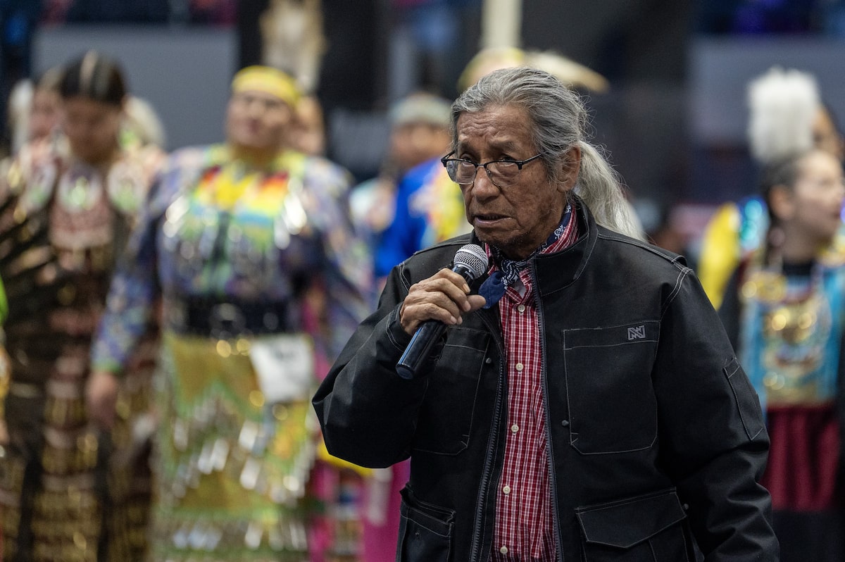 On the microphone, emcees Elmer Rattlesnake and Clifton Goodwill talked about the arrival of spring, and the importance of maintaining and reviving Indigenous languages and cultures.