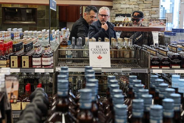 Provincial or territorial governments in B.C., Ontario, Quebec, Nova Scotia, Manitoba, Newfoundland and Labrador and Northwest Territories all announced bans or restrictions on sales of U.S. booze. Empty shelves with 'Buy Canadian Instead' signs at a B.C. Liquor Store in Vancouver on Feb. 2.Chris Helgren/Reuters