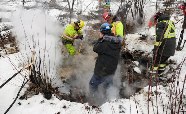 This handout picture provided by Alberta wildfire shows firefighters battling fires in Fox Lake that persist despite the cold and snow in Alberta on February 6.Supplied/Getty Images