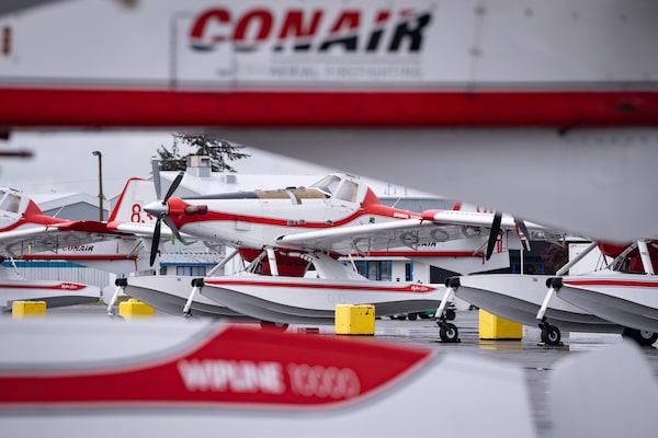 Conair Air Tractor AT802 Fire Bosses are parked on the tarmac in Abbotsford, B.C., on April. 26.ETHAN CAIRNS/The Canadian Press