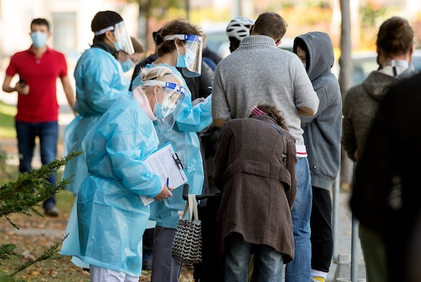 A health-care worker takes people’s details as they wait to be tested for COVID-19 at a testing clinic in Montreal, Oct. 4, 2020, as the COVID-19 pandemic continues in Canada and around the world.Graham Hughes/The Canadian Press