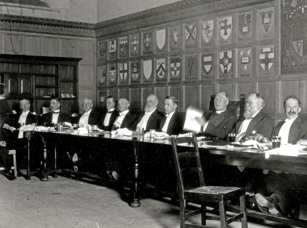 A banquet was held in the Great Hall of Hart House at the University of Toronto on Nov. 26, 1923, honouring Dr. Frederick Banting and Professor James McLeod, who shared the 1923 Nobel Prize for Medical Sciences for their discovery of insulin. Fifth from left is Dr. Charles H. Best, sitting beside Chief Justice Sir William Mulock (white beard), who is sitting next to Dr. Frederick Banting (fourth from right). Professor J. J. R. MacLeod [John James Rickard MacLeod] is at the far right. Others at the Head table include Canon Cody, Chairman of the Board of Governors, third from right; Sir Edmund Walker, Chancellor, second from right; Hon. W.F. Nickle, Attorney-General, fourth from left; Dean Alexander Primrose, third from left; and Albert E. Gooderham, second from left; and J.G. Fitzgerald, far left.John Boyd/The Globe and Mail