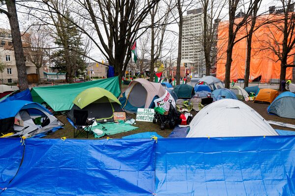 A general view of tents and tarps as pro-Palestinian protesters stage an encampment at Tabaret Hall at the University of Ottawa in Ottawa on May 1.Spencer Colby/The Canadian Press