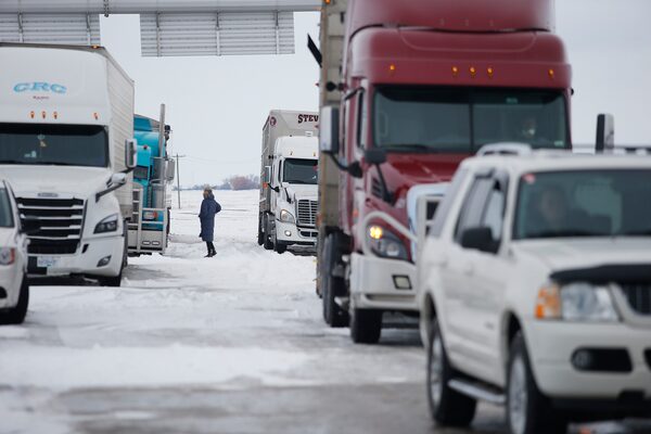 A person speaks to truckers as they block highway 75 with heavy trucks and farm equipment and access to the Canada-U.S. border crossing at Emerson, Man., on Feb. 10.JOHN WOODS/The Canadian Press