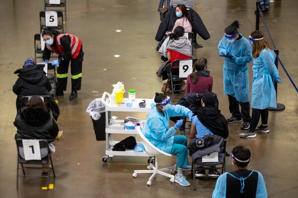 A COVID-19 vaccine is administered at a mass vaccination clinic in Mississauga, Ont., Dec. 24, 2021. As Omicron continues to escalate, a patchwork of policies around testing, tracing and isolating is emerging across the country.Chris Young/The Canadian Press