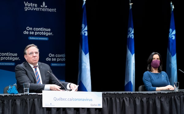 Montreal Mayor Valerie Plante wears her protective mask as Quebec Premier Francois Legault listens to a final question during a news conference in Montreal, on May 14, 2020.Paul Chiasson/The Canadian Press