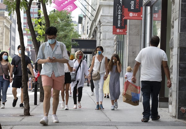 People wear masks as they shop on St.Catherine Street in downtown Montreal, Quebec, July 13, 2020. In Quebec, masks are mandatory in indoor public spaces as of today.Christinne Muschi/The Globe and Mail