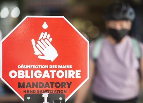 People wear face masks as they walk by a sign reading 'mandatory hand sanitization' in Montreal on July 24.Graham Hughes/The Canadian Press