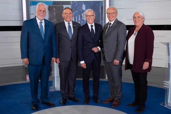Liberal Leader Philippe Couillard, Coalition Avenir Quebec Leader Francois Legault, moderator Pierre Bruneau, PQ Leader Jean-Francois Lisee and Quebec Solidaire Leader Manon Masse, left to right, pose for a photo prior to the third leaders' debate in Montreal, Que., on Sept. 20, 2018.Sebastien St-Jean